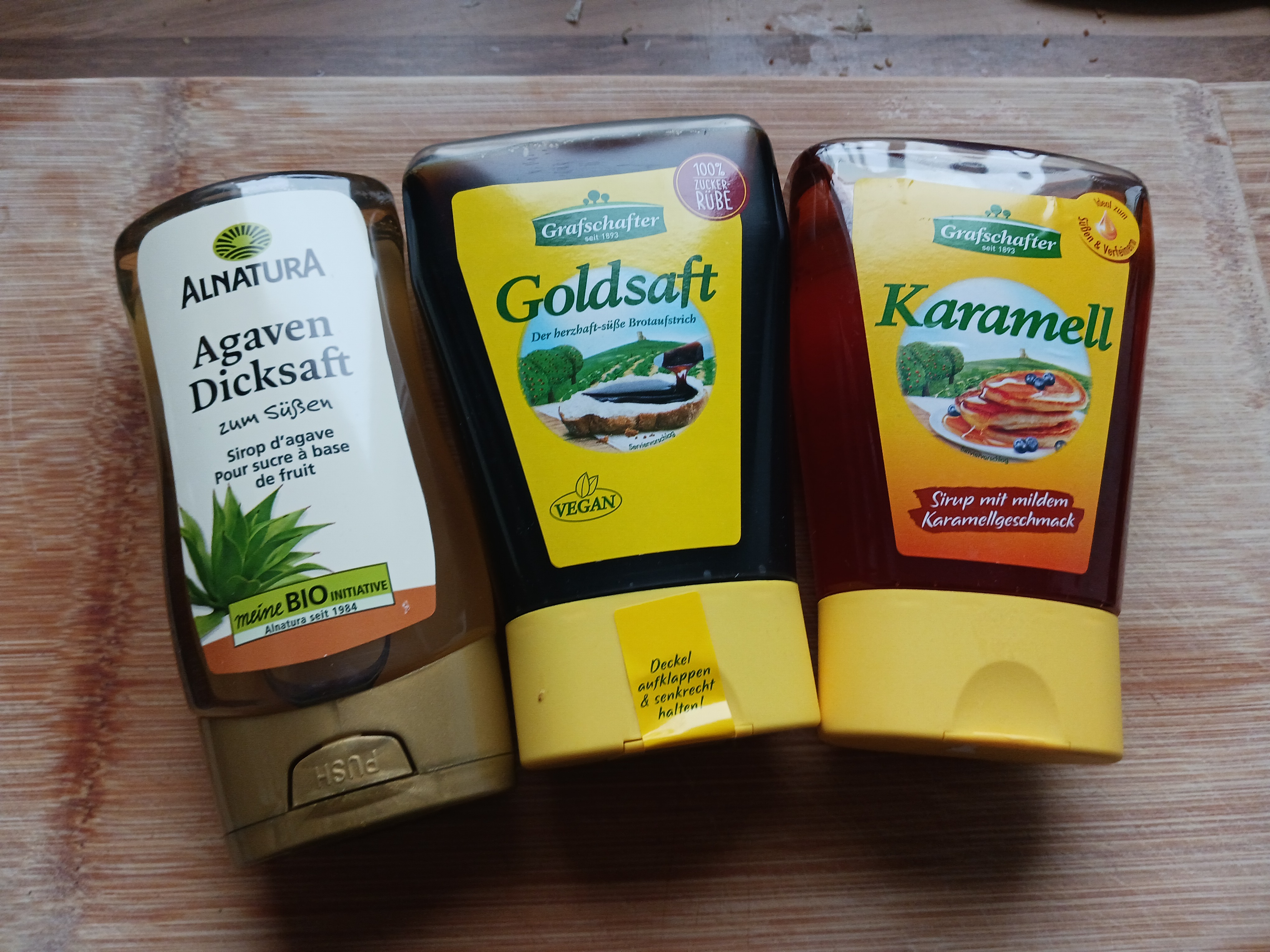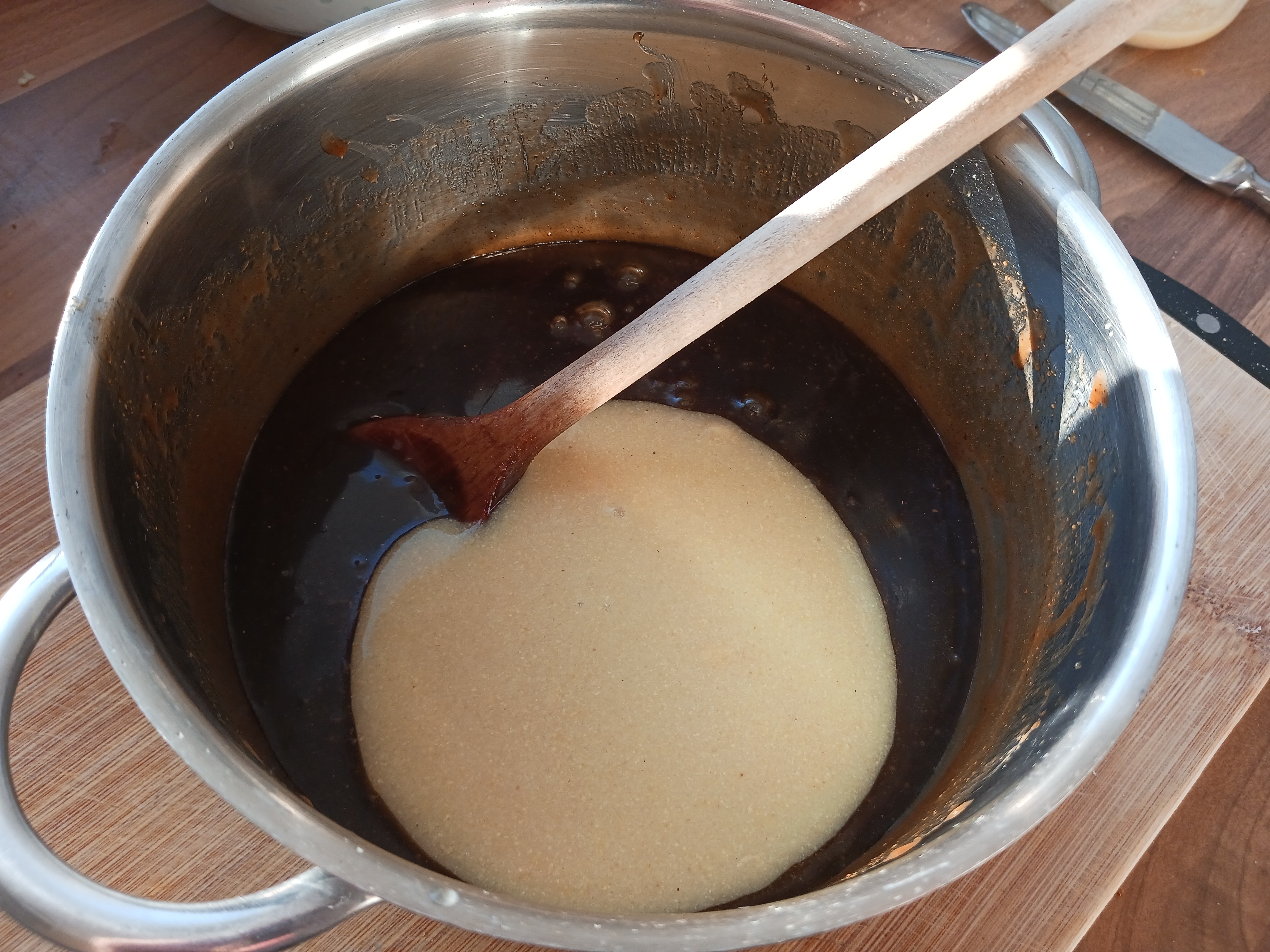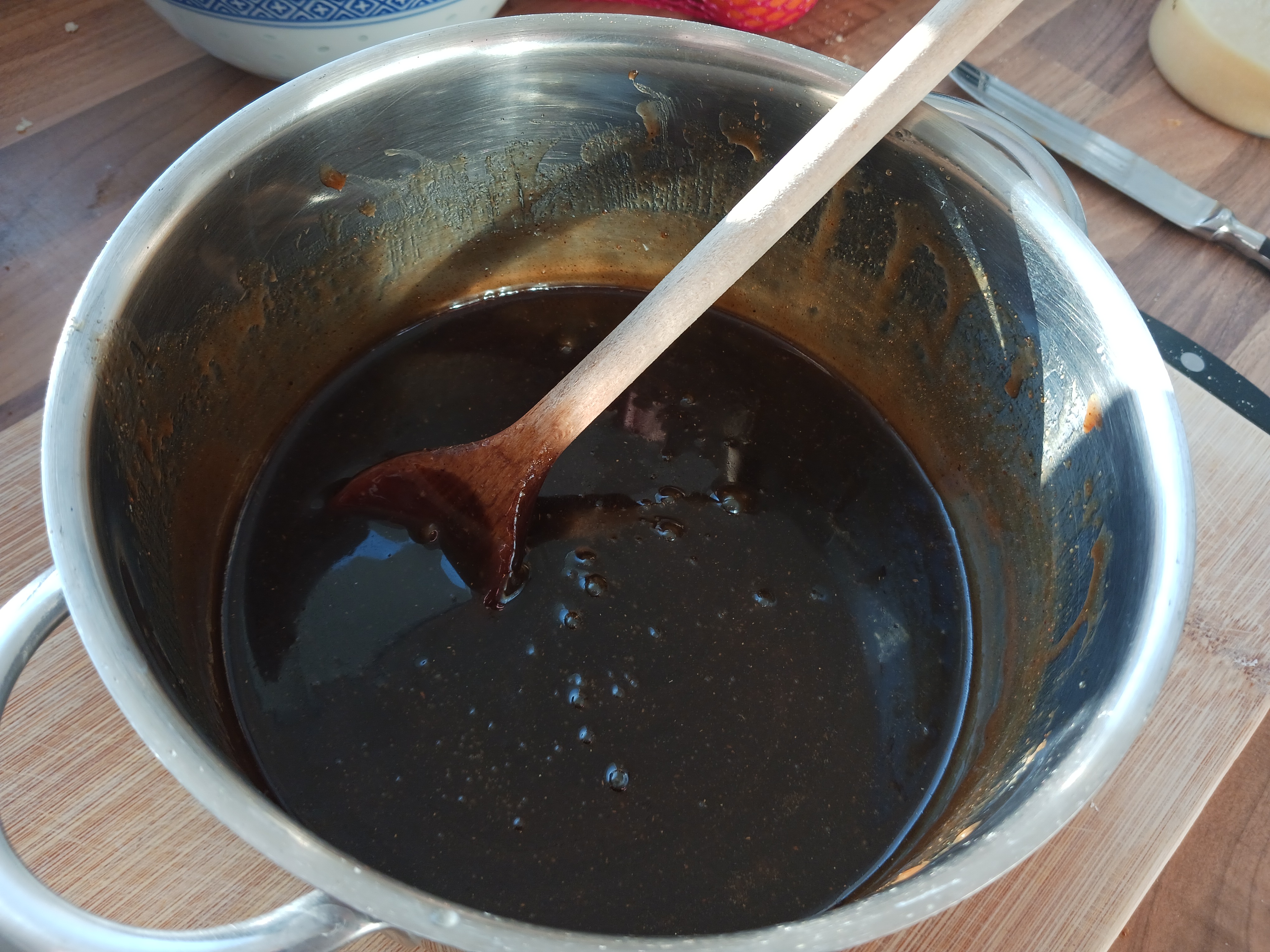 Rübensirup, Agavendicksaft und Invertzuckersirup als Honigersatz in einen Topf einwiegen. Wer Invertzuckersirup nicht finden kann: durch Rübensirup und Agavendicksaft ersetzen. Zucker und Magarine dazu geben, topf auf mittlerer Hitze erwärmen, bis sich der Kristallzucker gelöst hat. Lebkuchengewürz einrühren und Topf abkühlen lassen. Sobald die Molasse genügend abgekühlt ist (<30°C), den Ei Ersatz unterrühren.