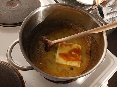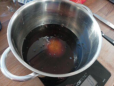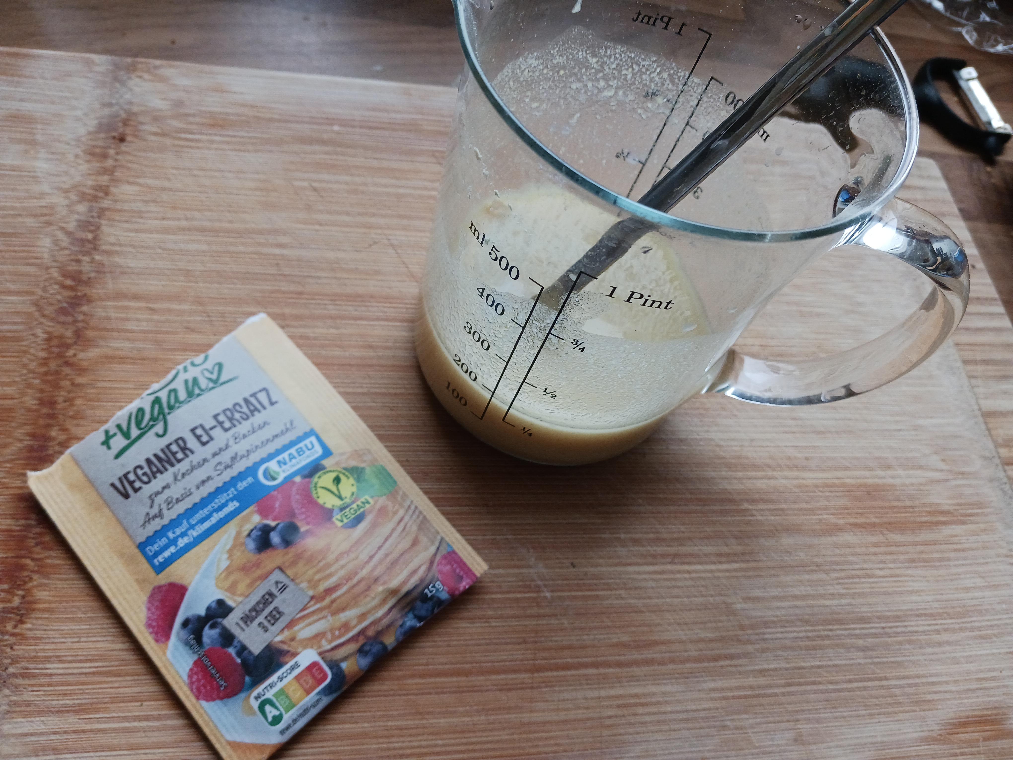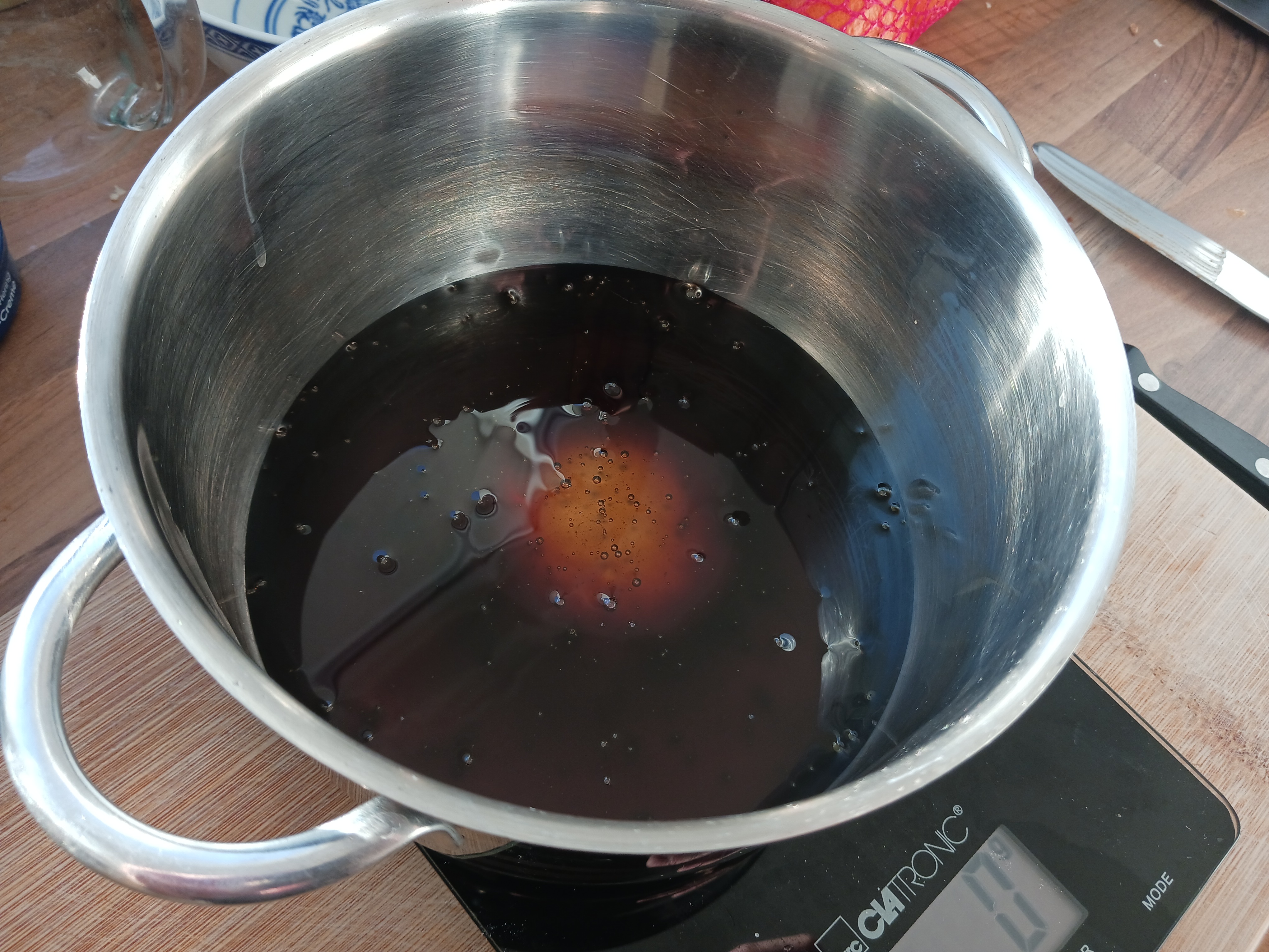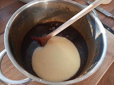 Rübensirup, Agavendicksaft und Invertzuckersirup als Honigersatz in einen Topf einwiegen. Wer Invertzuckersirup nicht finden kann: durch Rübensirup und Agavendicksaft ersetzen. Zucker und Magarine dazu geben, topf auf mittlerer Hitze erwärmen, bis sich der Kristallzucker gelöst hat. Lebkuchengewürz einrühren und Topf abkühlen lassen. Sobald die Molasse genügend abgekühlt ist (<30°C), den Ei Ersatz unterrühren.