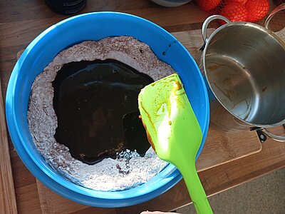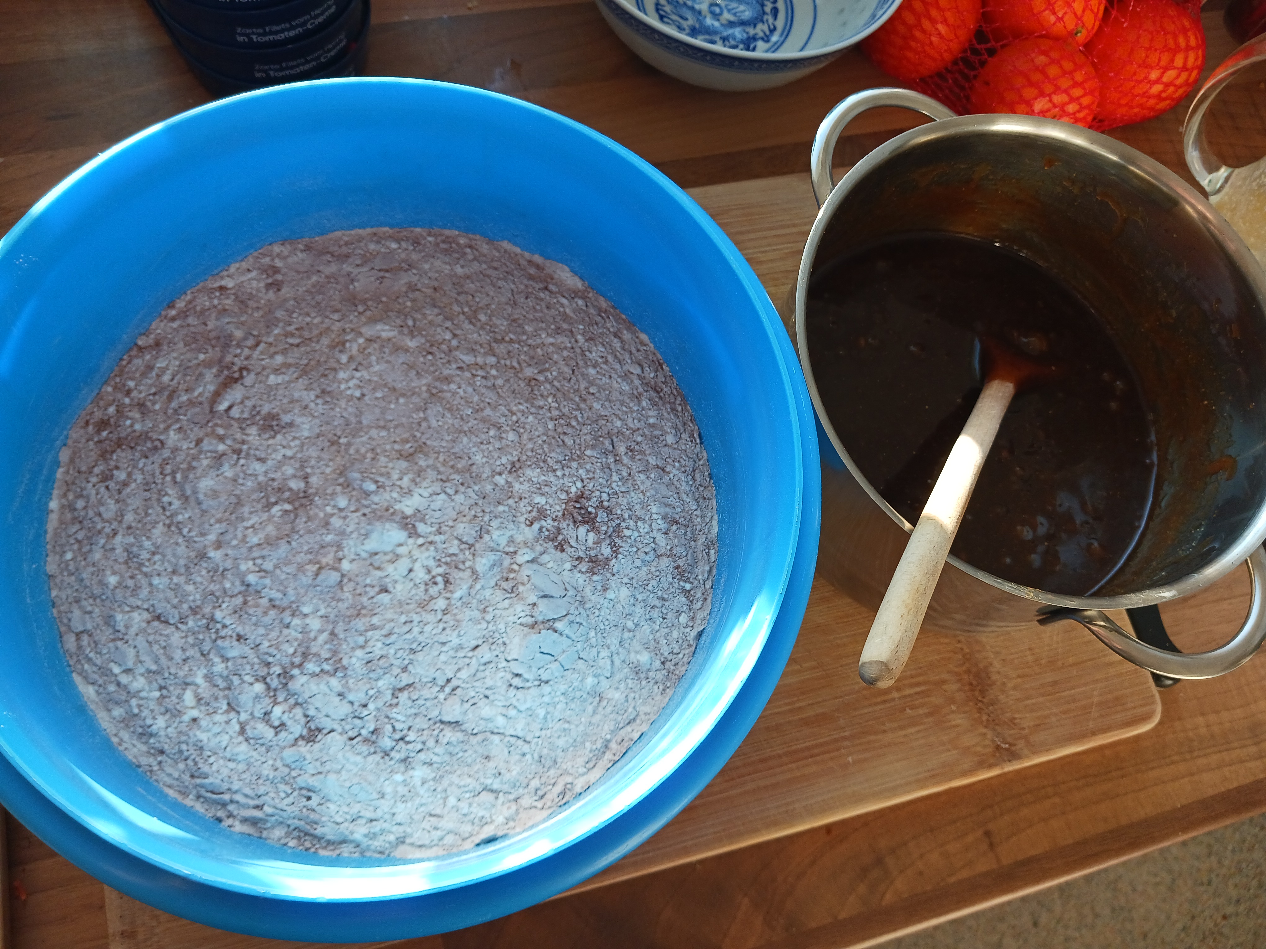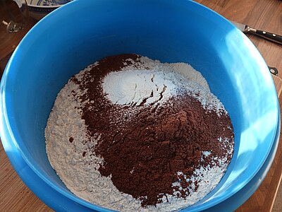 Solange die Molasse abkühlt, können Mehl, Backpulver und Kakaopulver in eine große Schüssel eingewogen werden. Mehl muss nicht gesiebt werden, aber Kakaopulver und Backpulver sicherheitshalber, damit keine Klumpen entstehen. Mehl einmal umrühren.