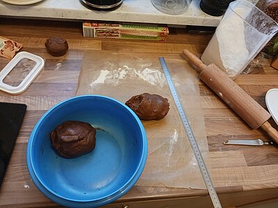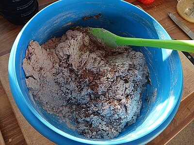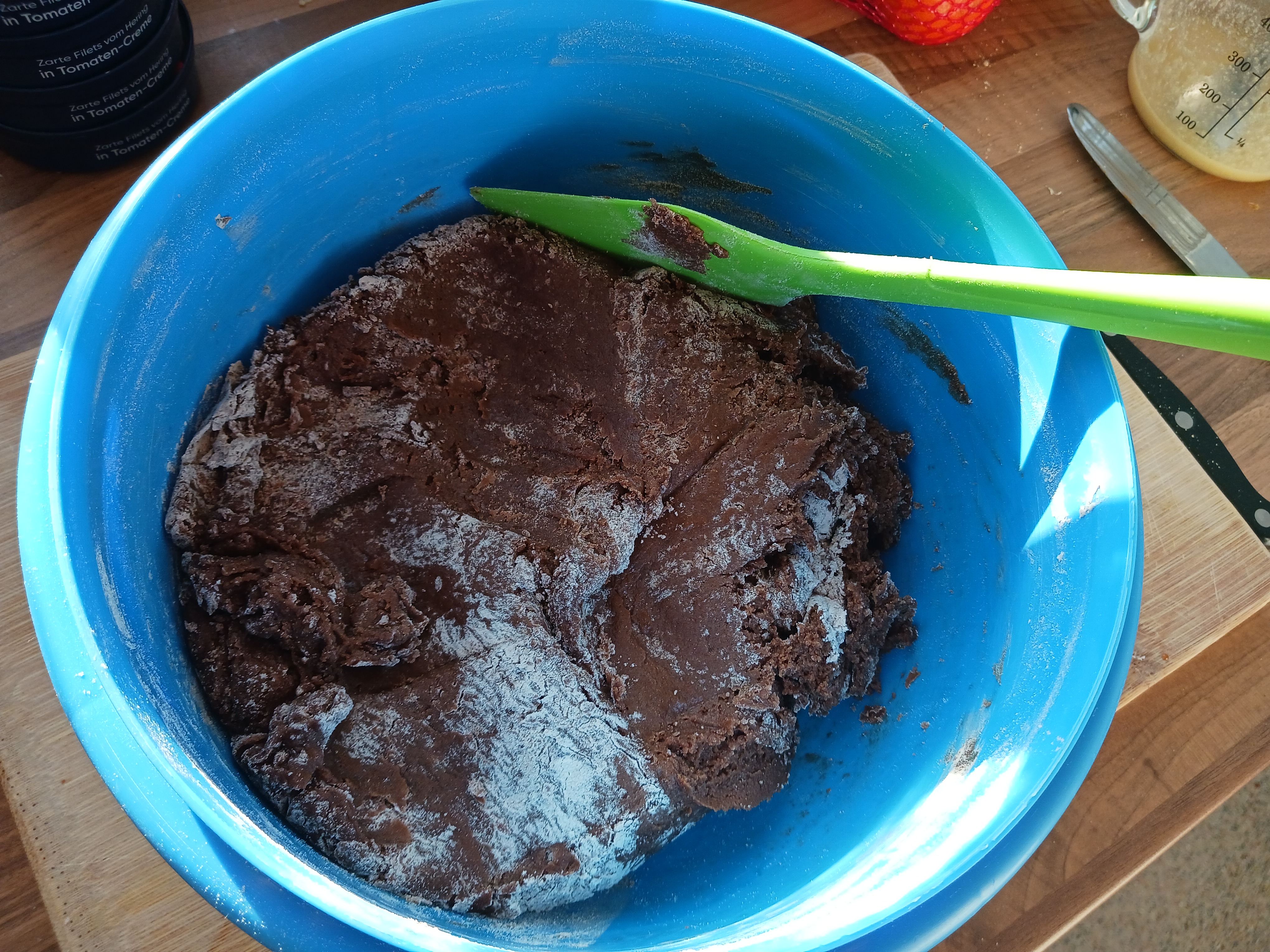 Ist das Ei in der Molasse eingerührt, kann die Molasse in die Mehl Schüssel gegeben und verrührt werden. Am besten mit einem Silikon-Teigschaber. Den Teig langsam rühren, bis das Mehl die Molasse aufgenommen hat. Den Teig zum Schluss nochmal per Hand um falten, um alle Mehlreste einzuarbeiten. Teig abgedeckt im Kühlschrank ruhen lassen für ~20 Minuten.