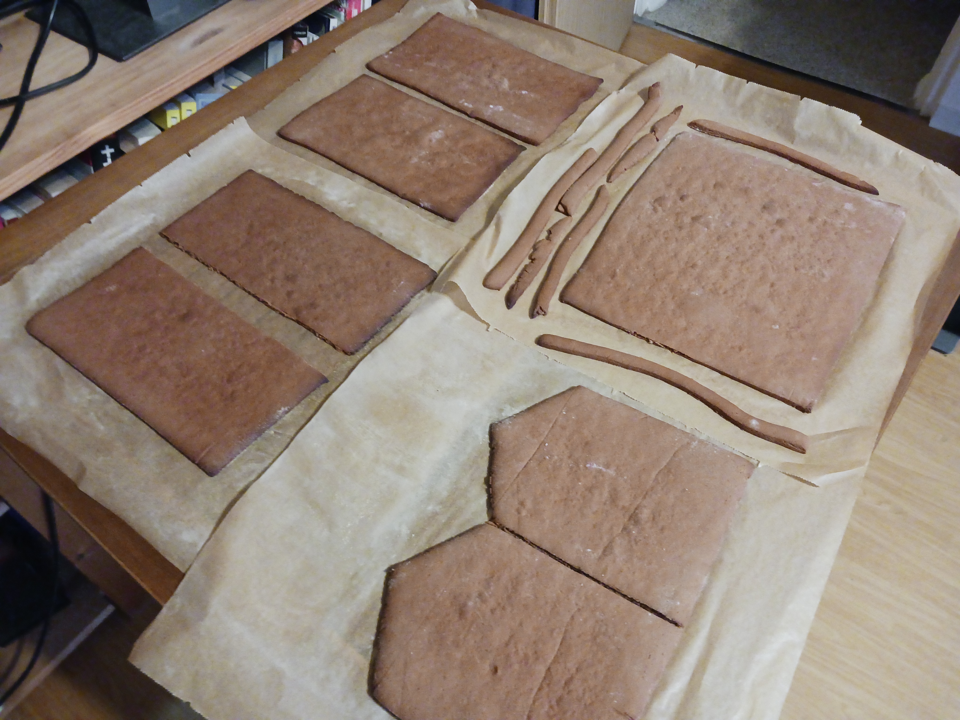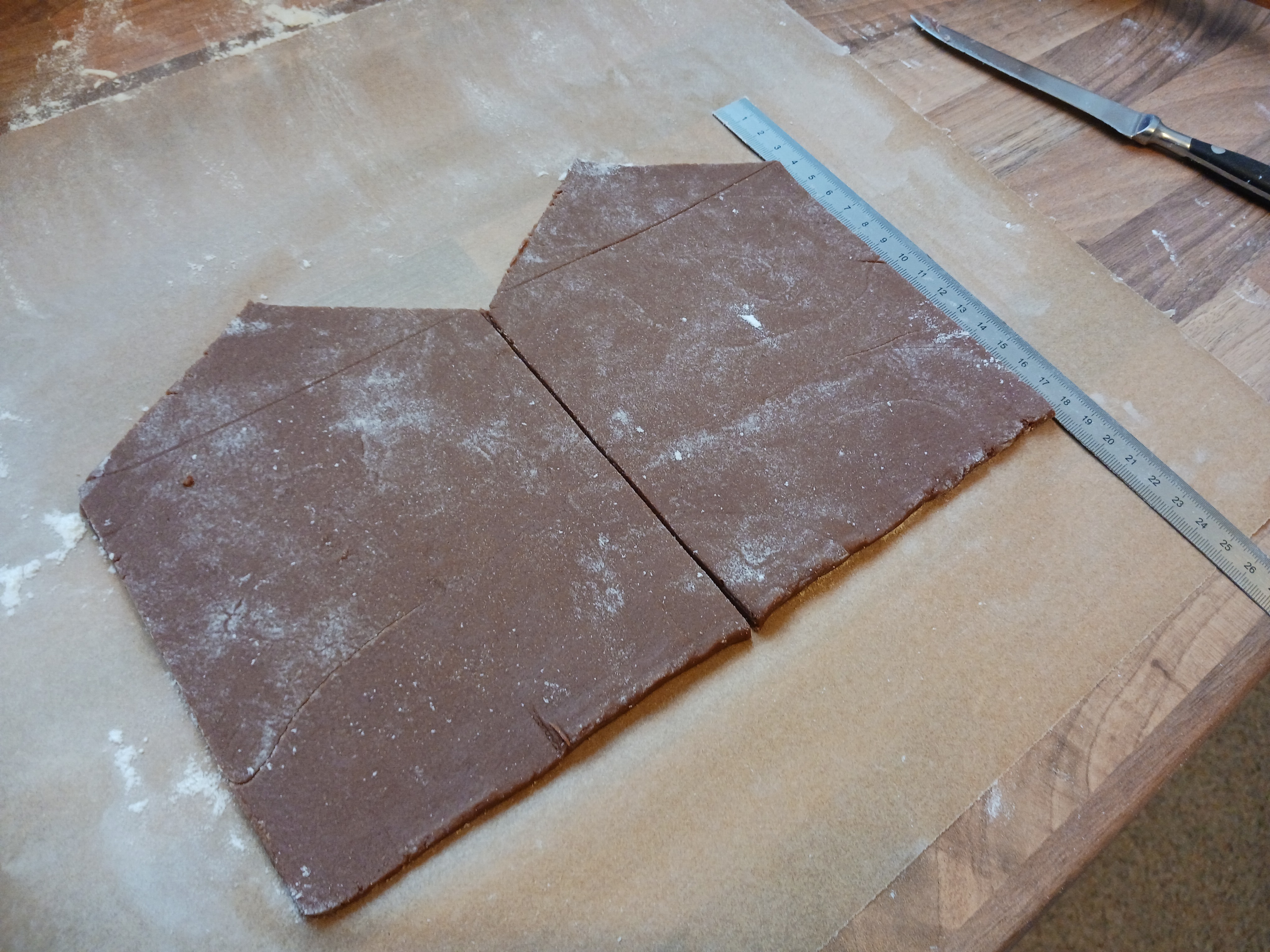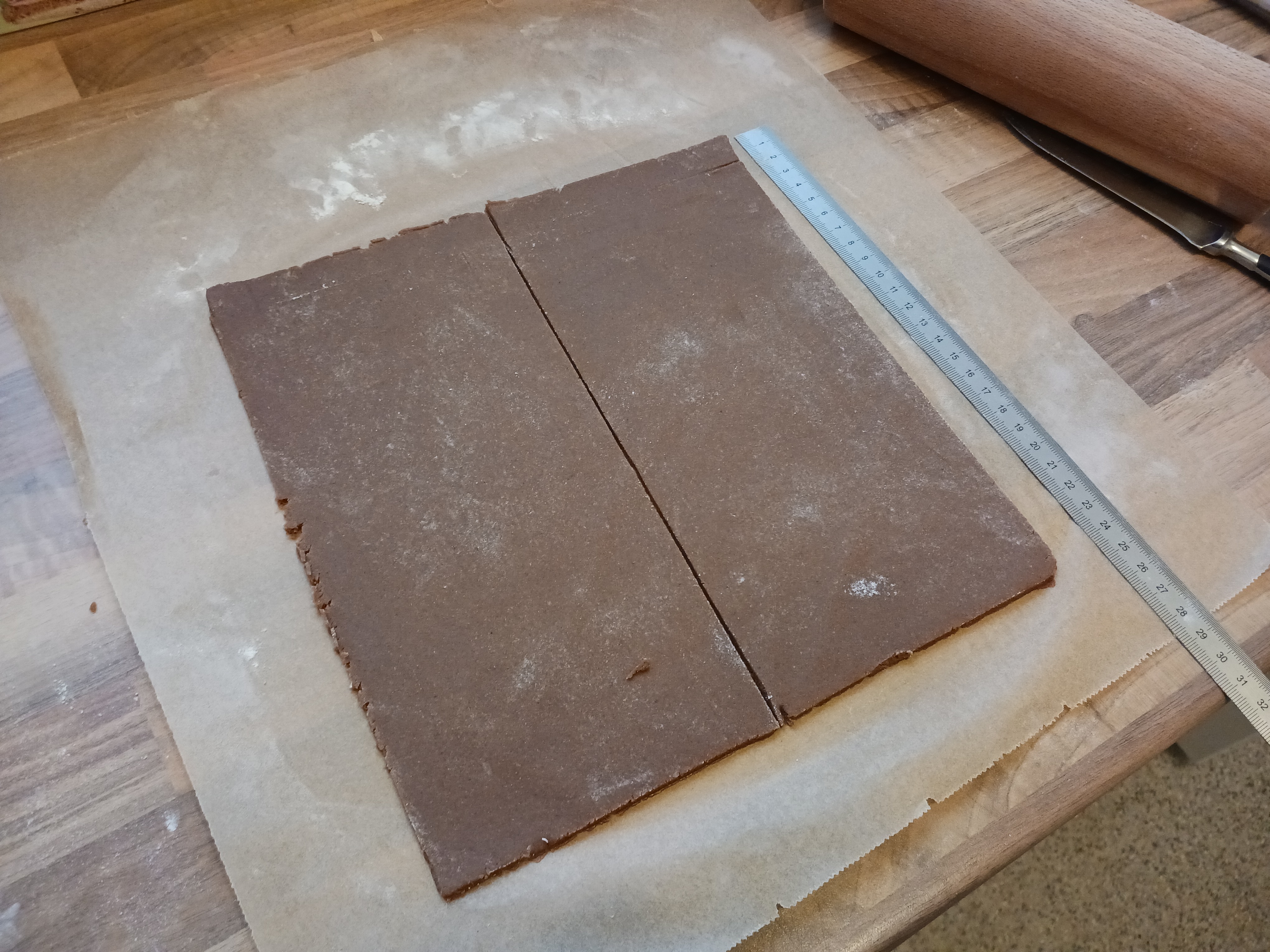 Teig in Drittel teilen, mit Mehl auf Backpapier auswalzen und mit einem Stahlmaß (oder lineal) diese Zuschnitte ausschneiden:
