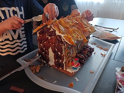 Steht das Haus stabil, können die Flächen mit Zuckerguss bestrichen, und mit Süßigkeiten verziert werden.