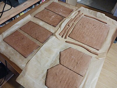 Wände und Seitenteile mit der Zuckermasse auf die Bodenplatte oder ein Schneidbrett kleben. Mit einem Messer die Innenkanten mit Zuckermasse nachziehen, dann die Dachteile ankleben.