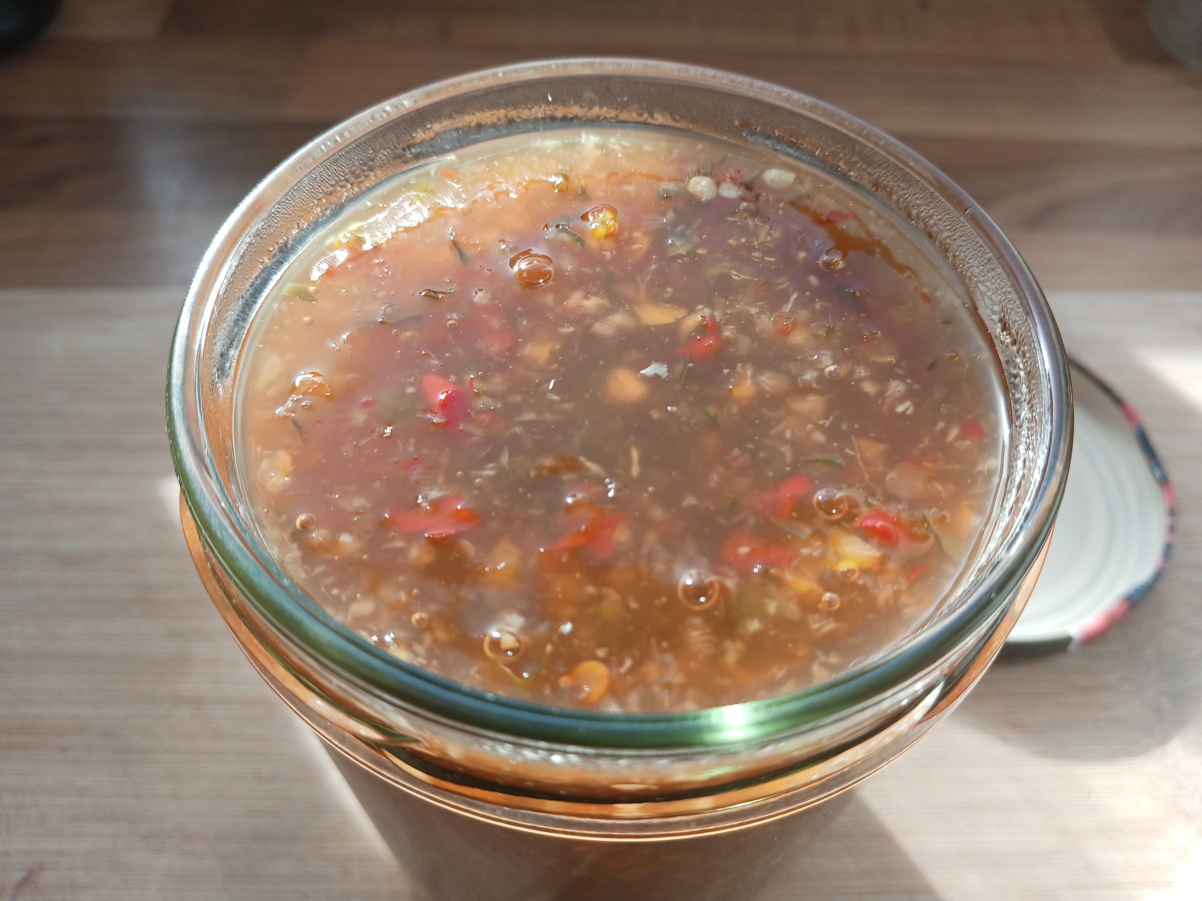 In ein Glas abfüllen und abkühlen lassen. Im Kühlschrank gelagert sollte die Soße lange haltbar bleiben.